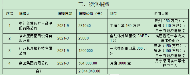 福建省红十字会2021年度9月份接受捐赠收支情况公示