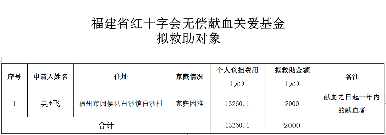 根据《福建省红十字会无偿献血关爱基金管理办法(试行)》规定,现对拟获得福建省红十字会无偿献血关爱基金救助的吴*飞予以公示,公示期5个工作日(2025年10月13日-2025年10月17日)。