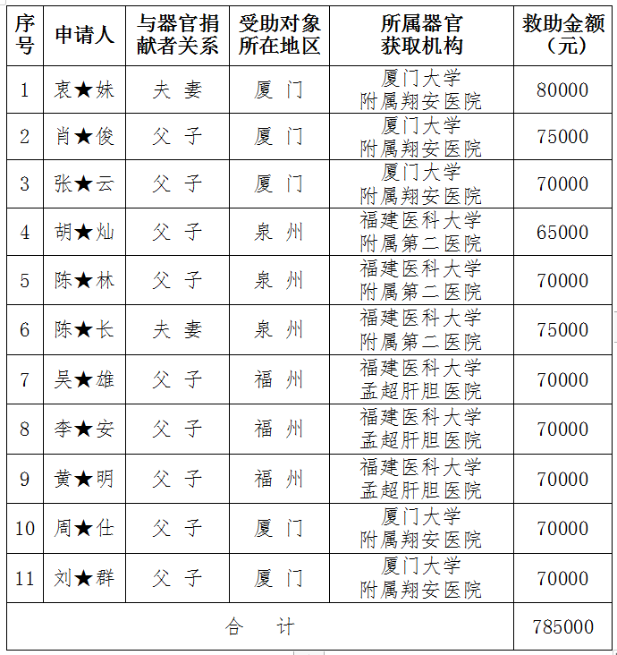 福建省人体器官捐献者困难家庭2025年度10月救助情况