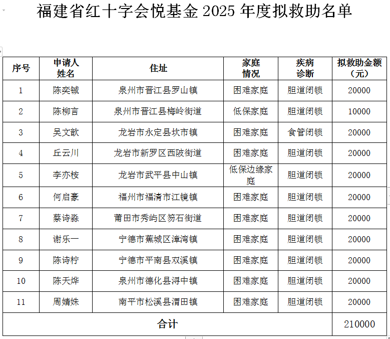 根据《福建省红十字会悦基金管理办法(暂行)》规定,现对拟获得福建省红十字会悦基金2025年度资助的陈奕铖等11名患儿予以公示,公示期3个工作日(2026年4月3日-2026年4月8日)。