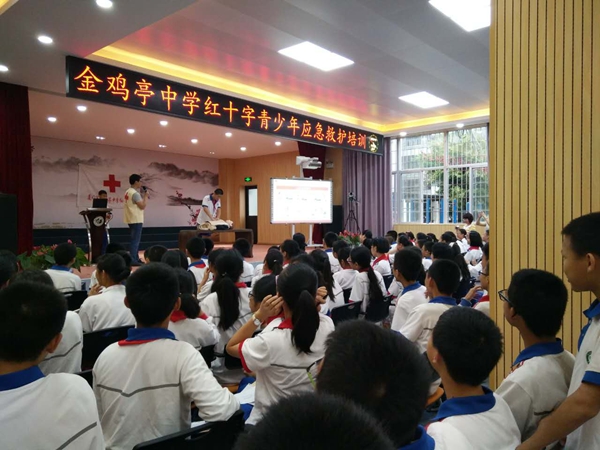 金鸡亭社区红十字会与金鸡亭中学一起开展红十字应急救护培训活动。