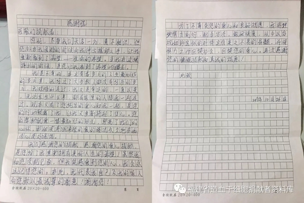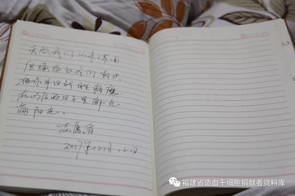 看完信后,钟葛锋思绪万千,赶紧叫朋友拿来笔和纸,想要写一封回信鼓励患者,但考虑到造血干细胞要在第一时间进行运送,纵有千言万语,他也只能在纸上简短地写上几句祝福。